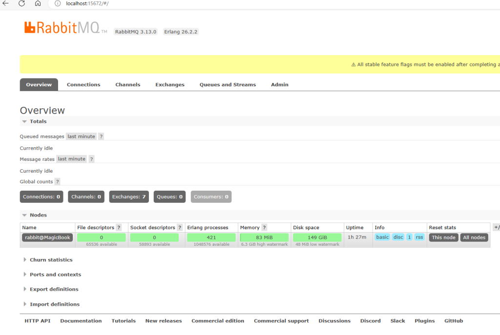 重启电脑后,我们在浏览器中访问 RabbitMQ 的控制台地址:http://localhost:15672。