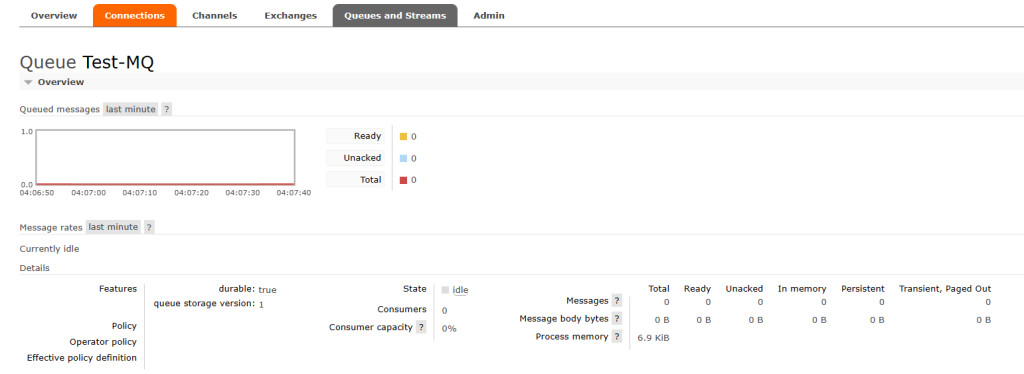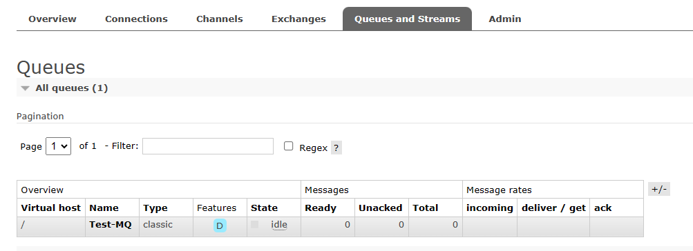添加成功之后,在 All queues 选项页能够刚才创建的队列 Test-MQ 的信息。