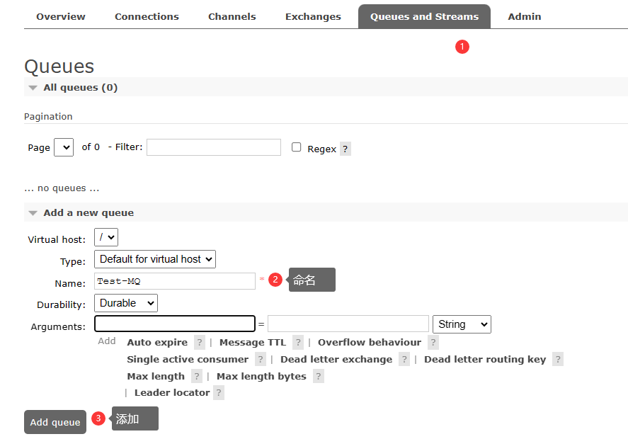 点击进入 Queues and Streams 选项页,创建一个新的队列,命名为 Test-MQ。