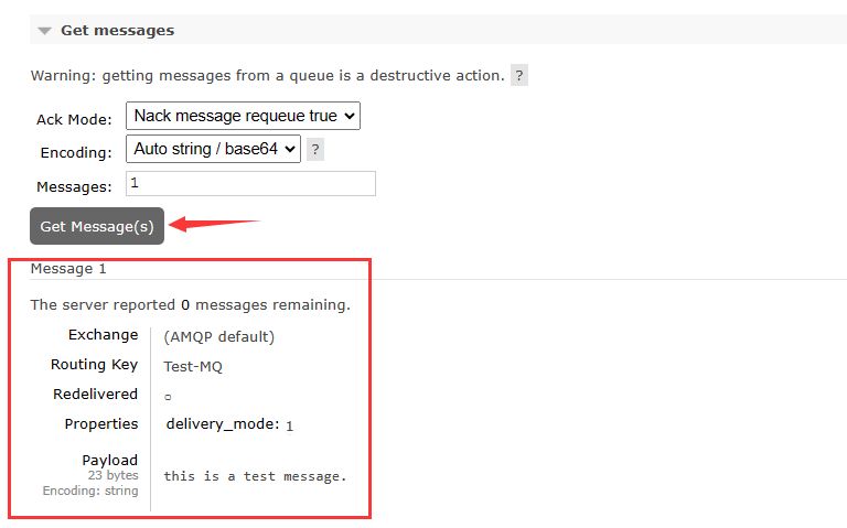 接着我们点击 Get messages 里的 Get Meassge(s) 来接收消息,可以看到我们刚刚发送的消息被成功接收,消息内容为:”This is a test message.”