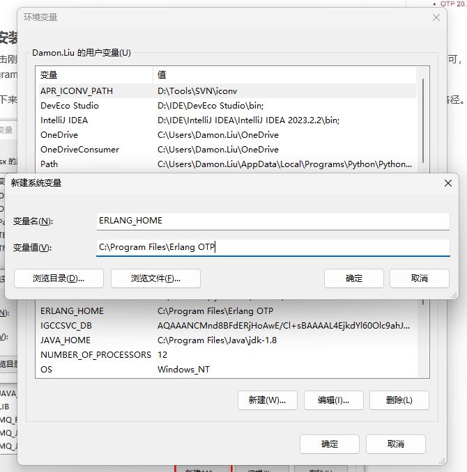 配置环境变量,添加系统变量 ERLANG_HOME,变量值为 Erlang 安装路径。
