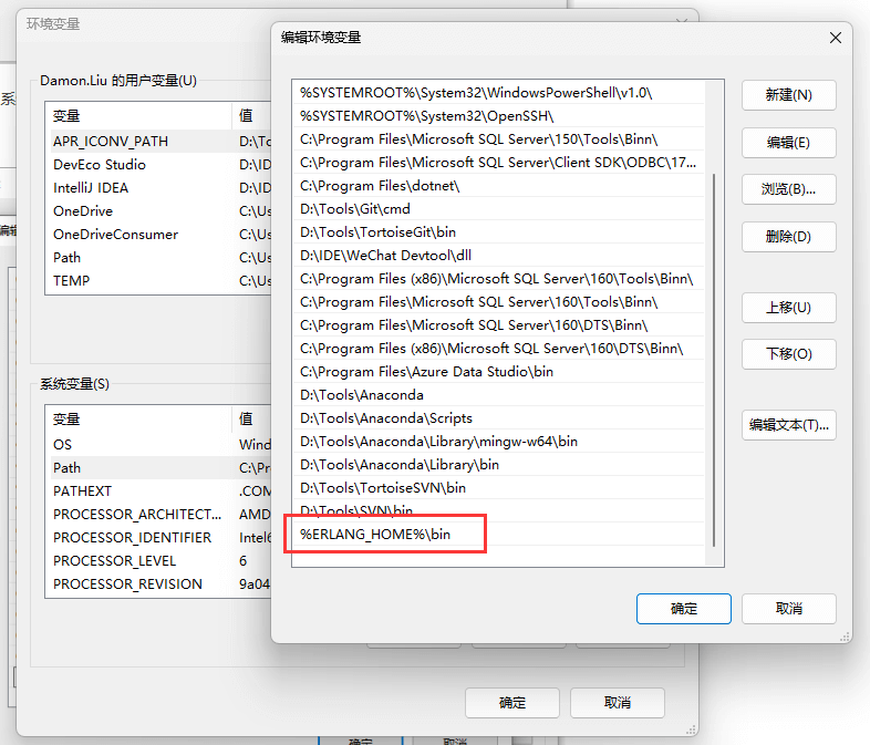 再将 Erlang 的 bin 目录添加到系统 PATH 路径中,变量值为 %ERLANG_HOME%\bin。