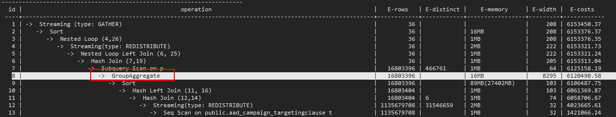 1) 识别stream数量多的语句:select *,(length(query_plan) - length(replace(query_plan, 'Streaming', ''))) / length('Streaming') as stream_count FROM pgxc_wlm_session_info ORDER BY stream_count DESC limit 100;