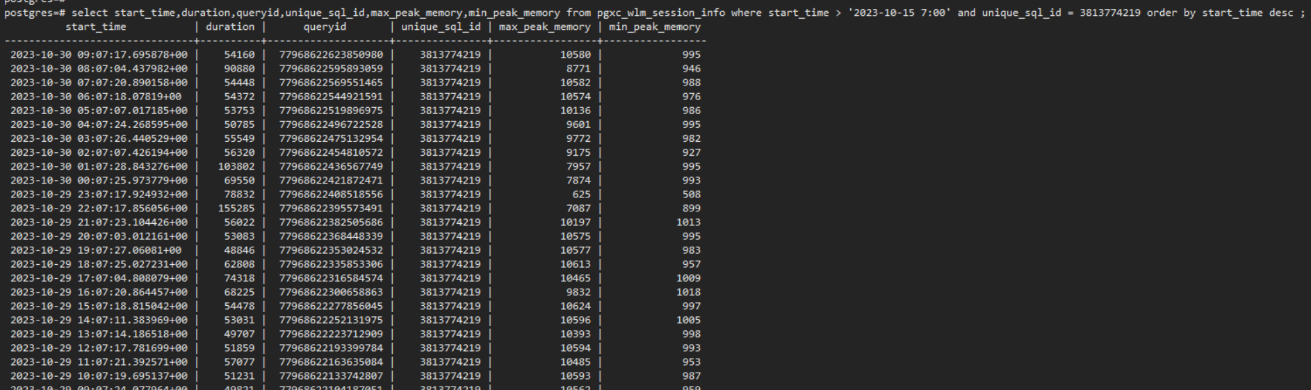 Select * from pgxc_wlm_session_info where start_time > '2023-10-30 10:05' and start_time < '2023-10-30 10:10' order by max_peak_memory desc limit 100;