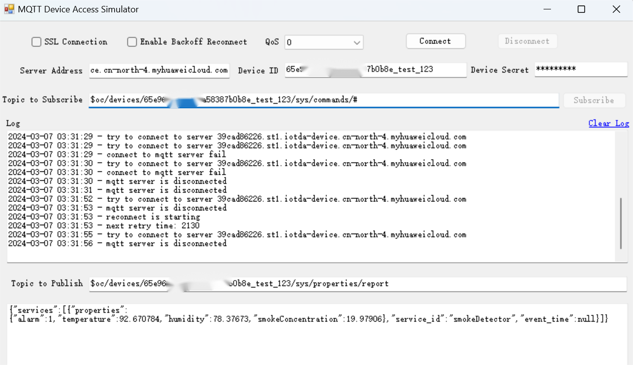 4、下载并启动模拟器,填写Server地址、设备ID和设备密钥。