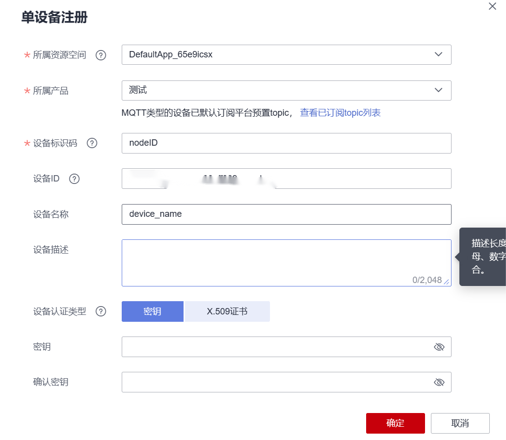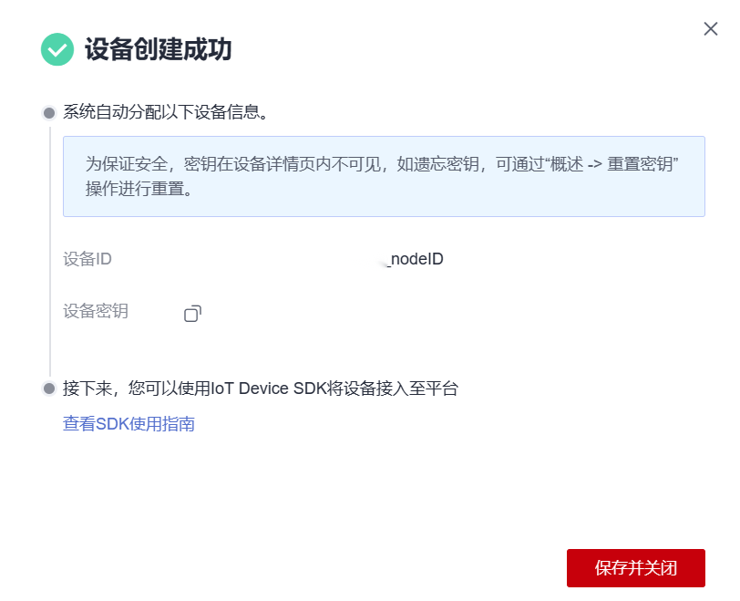 3、接下来,创建MQTT协议产品,注册设备,并妥善保管设备ID和密钥。
