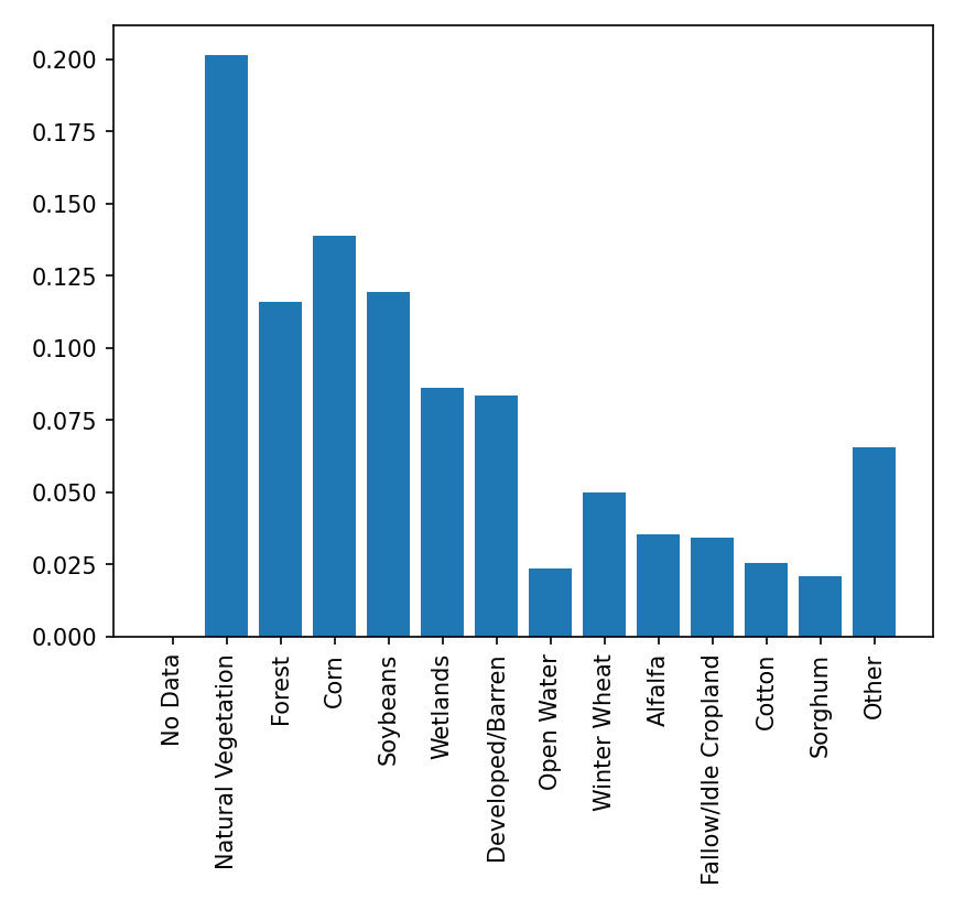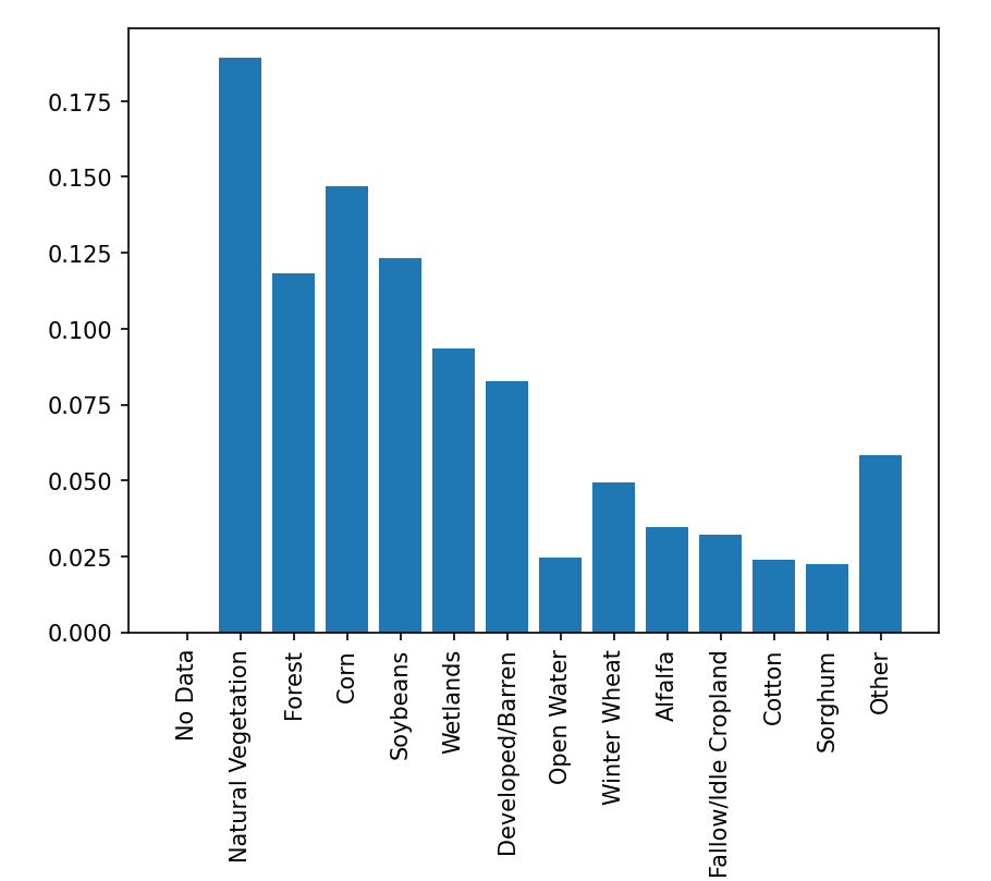 0 : "No Data" 1 : "Natural Vegetation" 2 : "Forest" 3 : "Corn" 4 : "Soybeans" 5 : "Wetlands" 6 : "Developed/Barren" 7 : "Open Water" 8 : "Winter Wheat" 9 : "Alfalfa" 10 : "Fallow/Idle Cropland" 11 : "Cotton" 12 : "Sorghum" 13 : "Other"