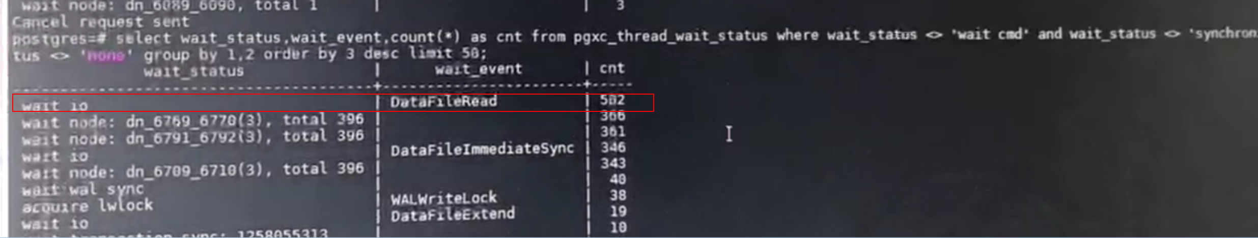 SELECT wait_status,wait_event,count(*) as cnt FROM pgxc_thread_wait_status WHERE wait_status not in('wait cmd', 'synchronize quit', 'wait stream task') GROUP BY 1,2 ORDER BY 3 DESC limit 100;
