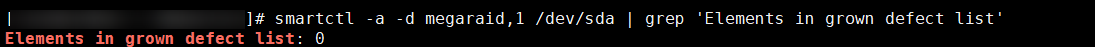 smartctl -a -d sat+megaraid,{DID} /dev/sd* | grep 'Elements in grown defect list'