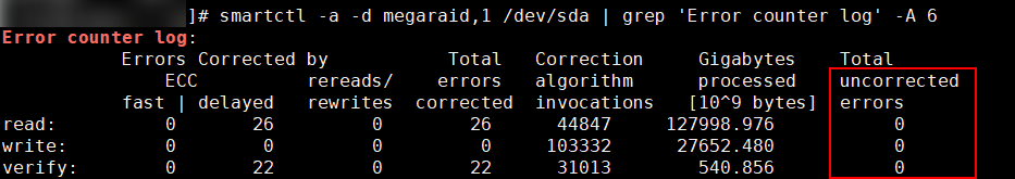 smartctl -a -d megaraid,{DID} /dev/sd* | grep 'Error counter log' -A 6