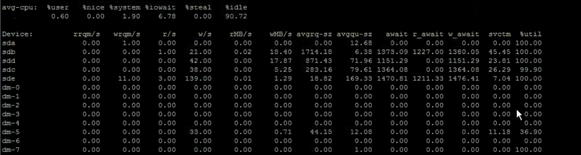 此时查看磁盘IO情况发现,存在%util飚高至100%,但读写数据量不高乃至几乎没有,await与svctm占用较高的情况,可能存在慢盘。