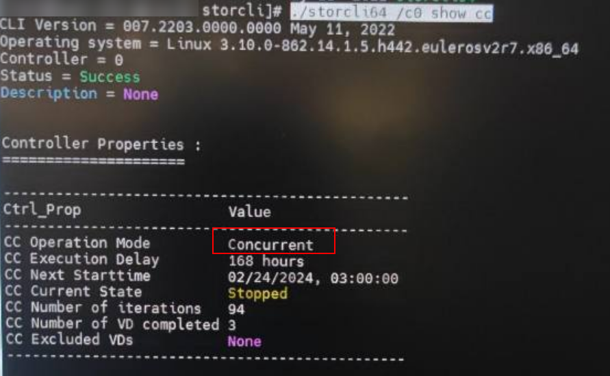 storcli64 /c{ctl_id} show cc #检查CC