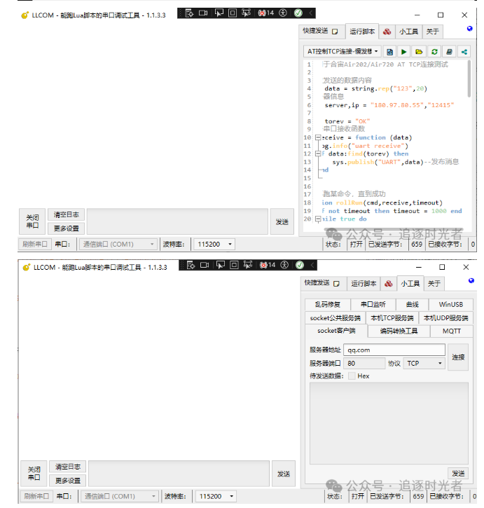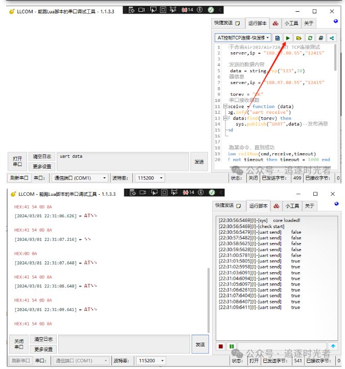 右侧的Lua脚本调试区域,可直接运行你写的串口测试脚本,如软件自带的: