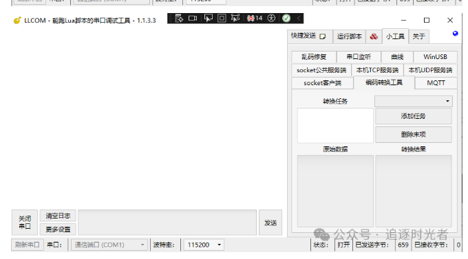 LLCOM是一个.NET开源的、功能强大的串口调试工具。支持Lua自动化处理、串口调试、串口监听、串口曲线、TCP测试、MQTT测试、编码转换、乱码恢复等功能。