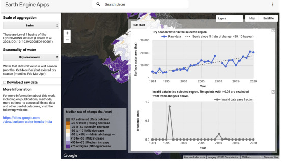 除了 Zenodo 数据库之外,这些数据还以交互式网络应用程序(;以下简称网站)的形式呈现,使用户能够直观地了解印度各地个别断面或流域的永久水量、雨季水量和旱季水量趋势以及数据缺失程度。该网站提供了一个简单的用户界面,使用户能够下载任何感兴趣地区的河网或流域尺度的 SWA 季节性时间序列。该网站还提供了有关访问年度永久、旱季和雨季合成数据的详细信息,这些数据作为可公开访问的云资产存储在谷歌地球引擎平台上。该数据集提供的空间(流域和河段)和时间(雨季、旱季和常年水量情景)尺度的信息可帮助我们深入了解印度的水系统。我们设想将该数据集作为基准信息层,与其他数据源结合使用,以支持区域水文趋势分析、流域分析和保护规划。具体应用包括但不限于监测和识别濒危湿地、可视化和测量水利基础设施项目(如水坝和取水项目)前后地表水范围的变化、绘制干旱易发地区地图以及绘制沿河网络 SWA 的自然和人为变化地图。预期用户包括但不限于学生、学者、决策者、规划者、政策制定者、活动家以及其他对水相关问题感兴趣的人士。