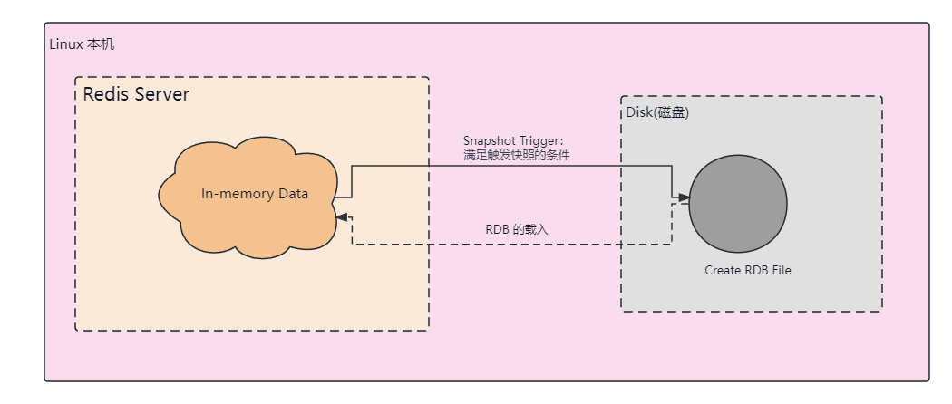 RDB 持久化方式是 Redis 将当前内存中的数据快照(snapshot)保存到硬盘的过程。换句话说,Redis 会创建一个代表某一时刻的数据集的磁盘文件。