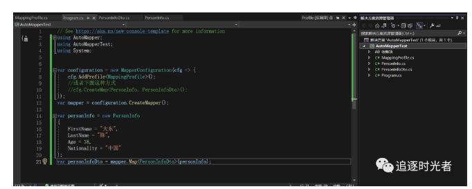 接下来我们分别定义一个源对象和一个目标对象,它们拥有相同的属性。例如,我创建一个名为PersonInfo的源对象和一个名为PersonInfoDto的目标对象: