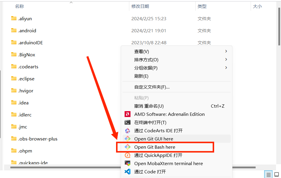1. 在电脑“C:\Users\Administrator”下鼠标右击,点击“Open Git Bash here”打开Git Bash。