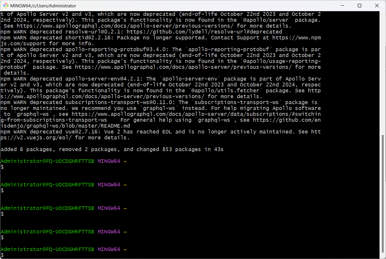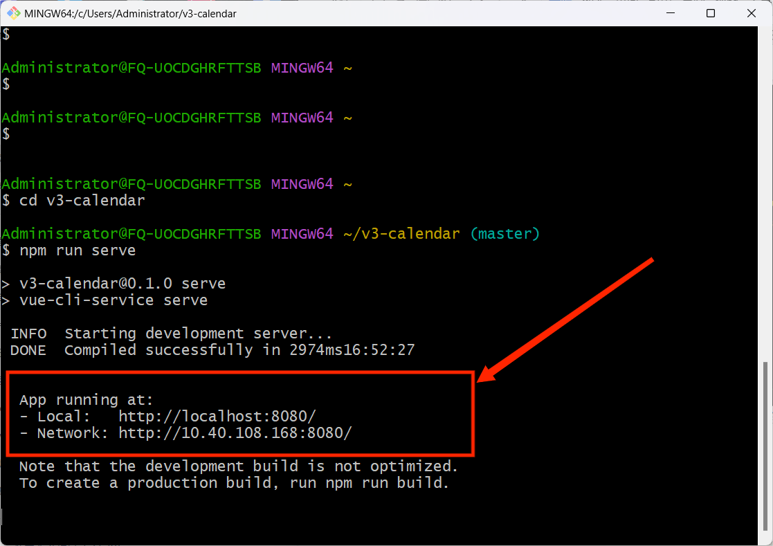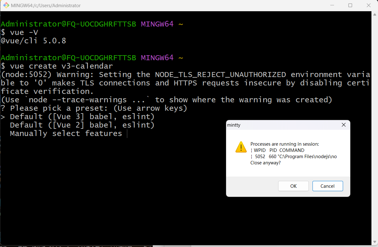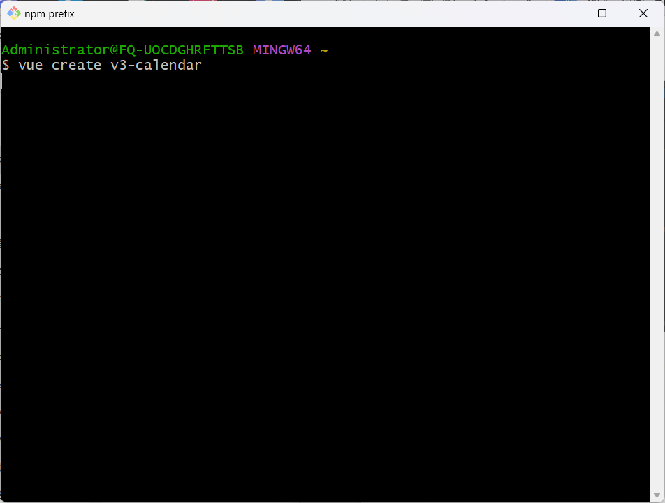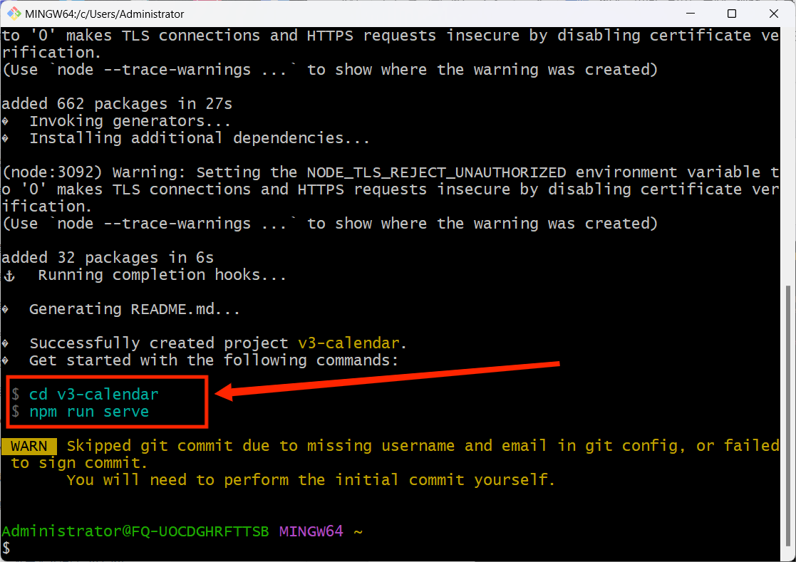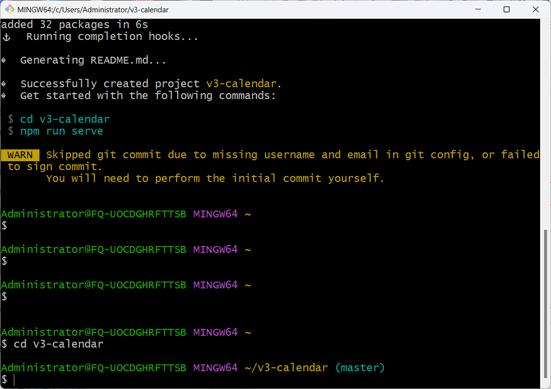 1. 保存完成后退出,重新回到“C:\Users\Administrator”文件夹下右击鼠标打开Git Bash,重新输入如下命令创建v3-calendar项目。