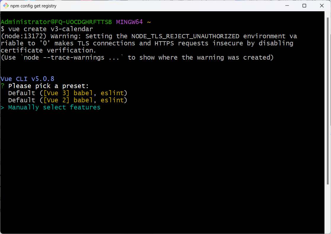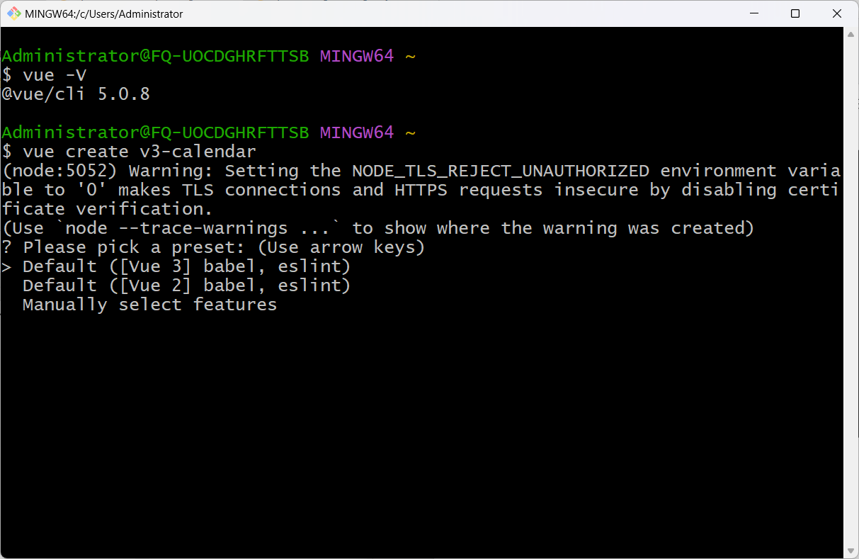 回车创建项目,v3-calendar是项目名称,可以自定义项目名字,然后开始进入一系列问答环节,default是默认配置,空格键多选,回车执行该选项。