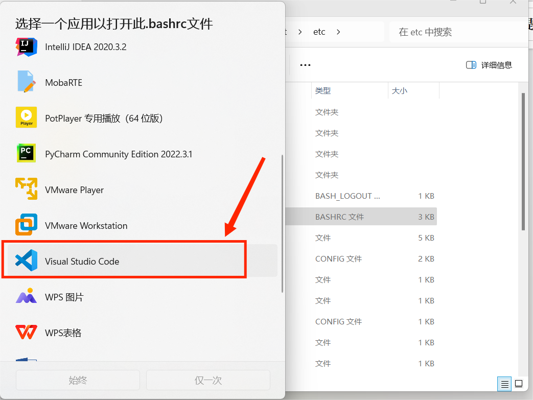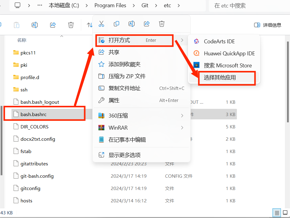 2. 在git bash的安装目录“C:\Program Files\Git\etc”下找到名为bash.bashrc的文件选中右击,通过Visual Studio Code打开(也可拖拽至Visual Studio Code打开)。