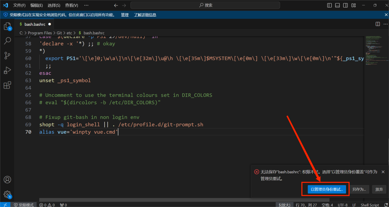 3. 打开后进入Visual Studio Code编辑界面,在文件最后添加如下代码并保存,若提示保存权限不足点击右下角提示框的“以管理员身份重试”即可。