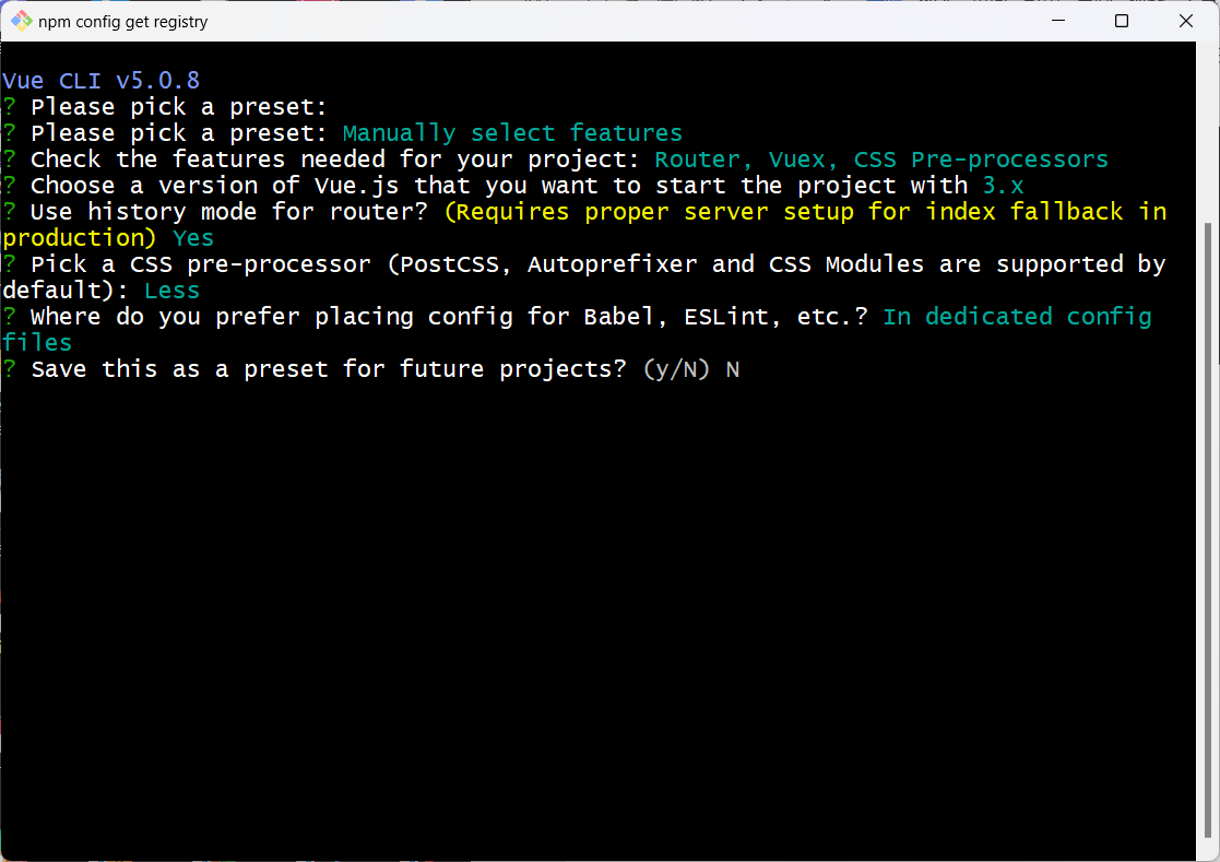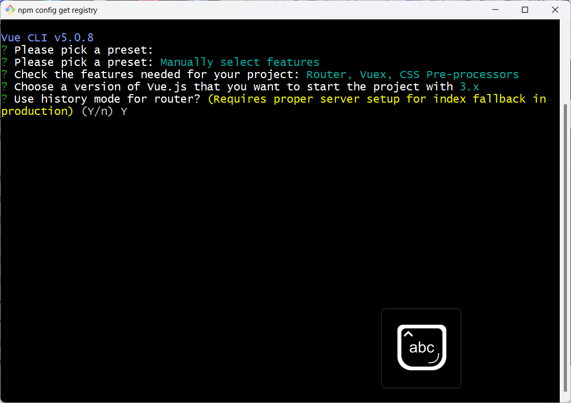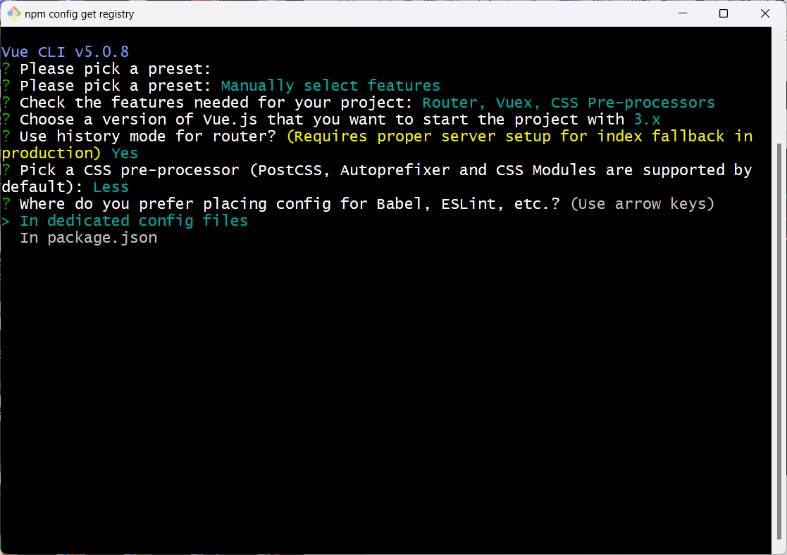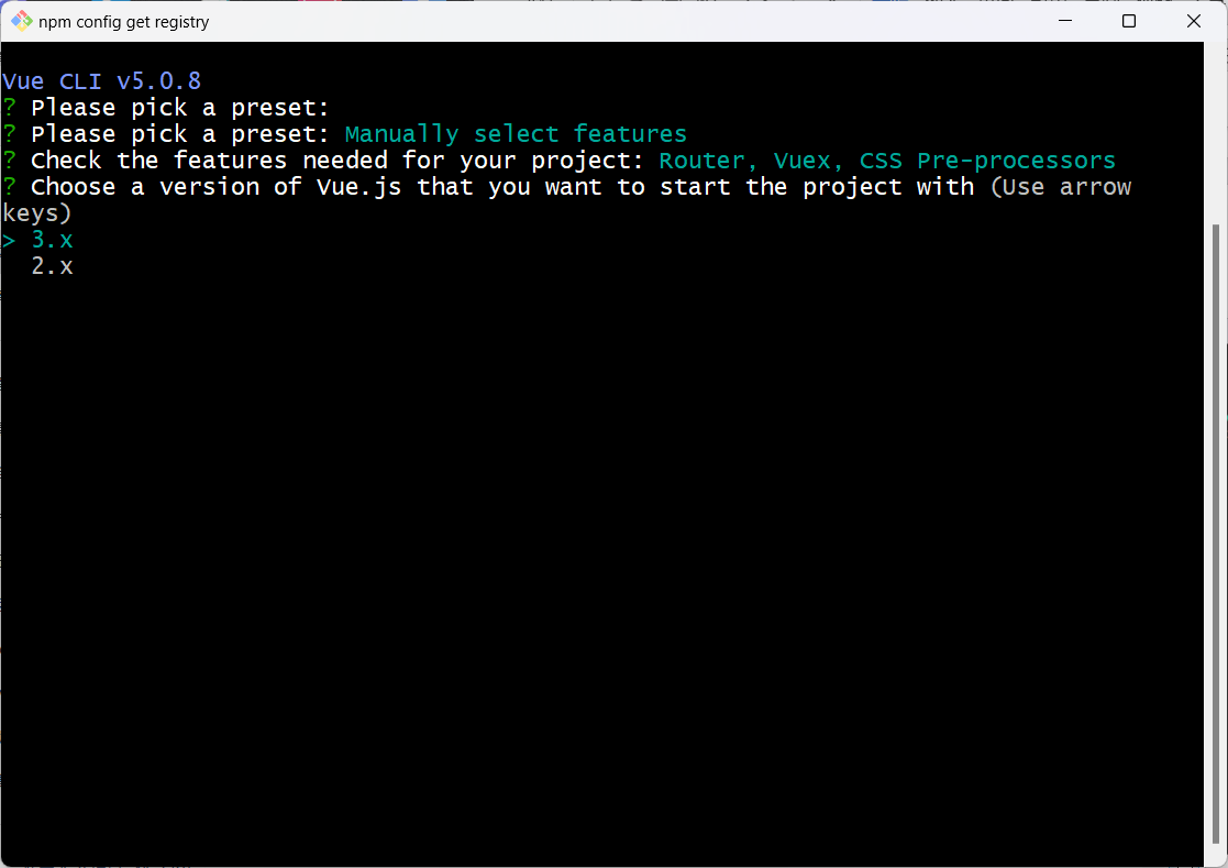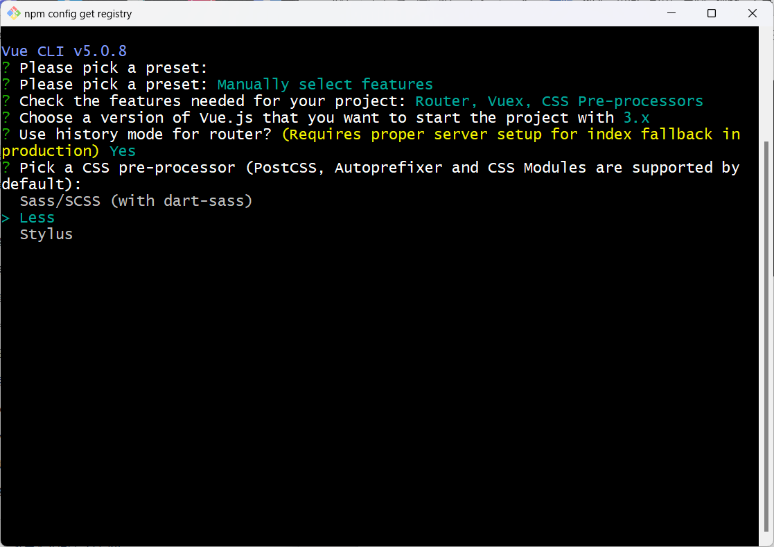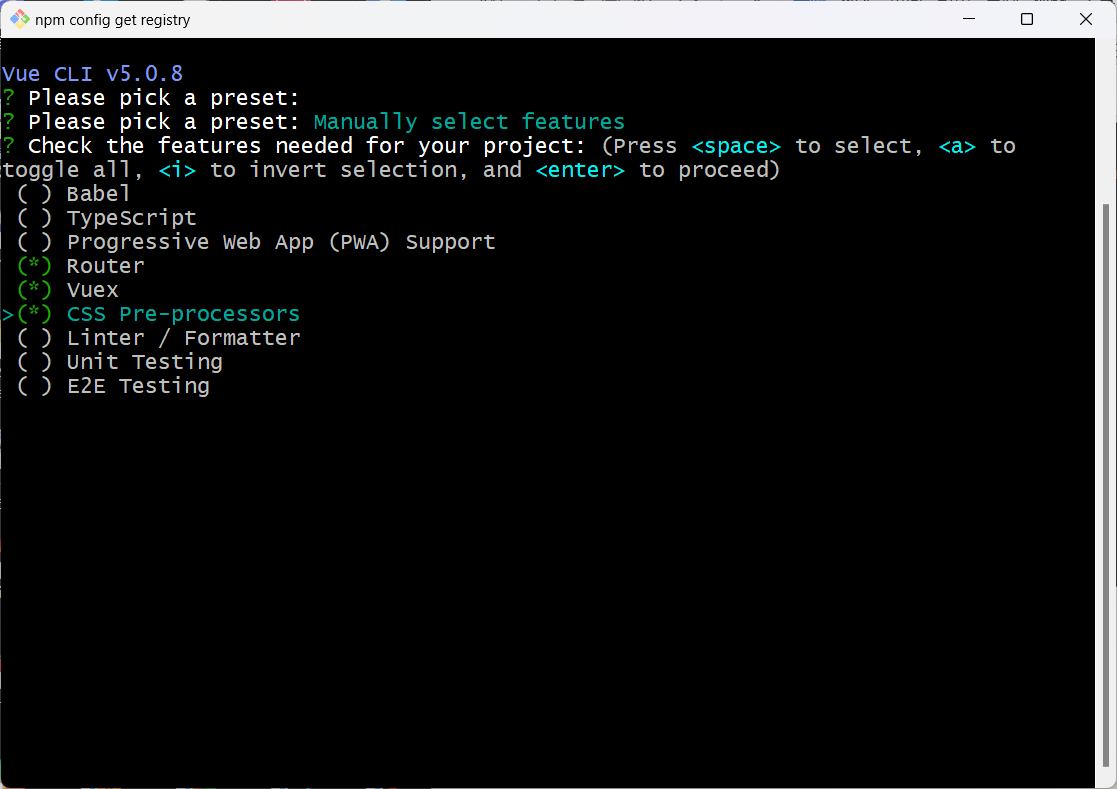 3. 如图,使用电脑空格键和上下键选择(勾选)“Router”、“Vuex”、“CSS Pre-processors”三项后按回车键。