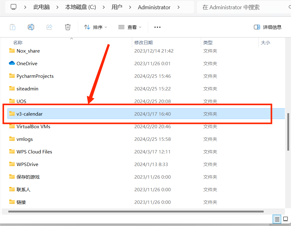 11. 回到“C:\Users\Administrator”文件夹,我们会发现多出一个名为“v3-calendar”的文件夹,这便是我们刚刚在Git Bash中创建的v3-calendar项目文件夹。