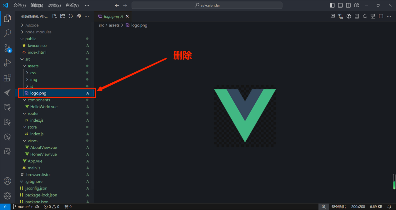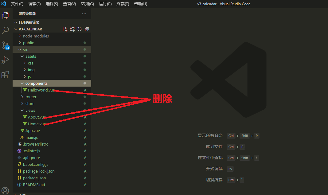 2. 删除src/components下的HelloWorld.vue文件,删除src/views下的AboutView.vue(About.vue)和HomeView.vue(Home.vue)文件。