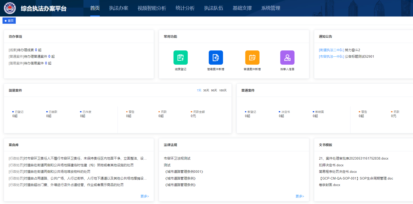 本系统共分为七个模块:首页、执法办案、视频智能分析、统计分析、执法队伍、基础支撑、系统管理;