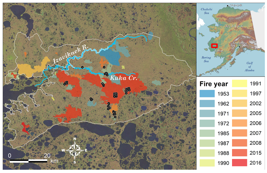 阿拉斯加的育空-库斯科克维姆三角洲(YKD)是北极苔原生物群落中最温暖的地区之一,苔原火灾在其高地地区很常见。自 1953 年以来,约 20% 的育空地区(789 平方公里)经历过火灾,其中约一半的火灾发生在 2015 年(AICC,2019 年)。