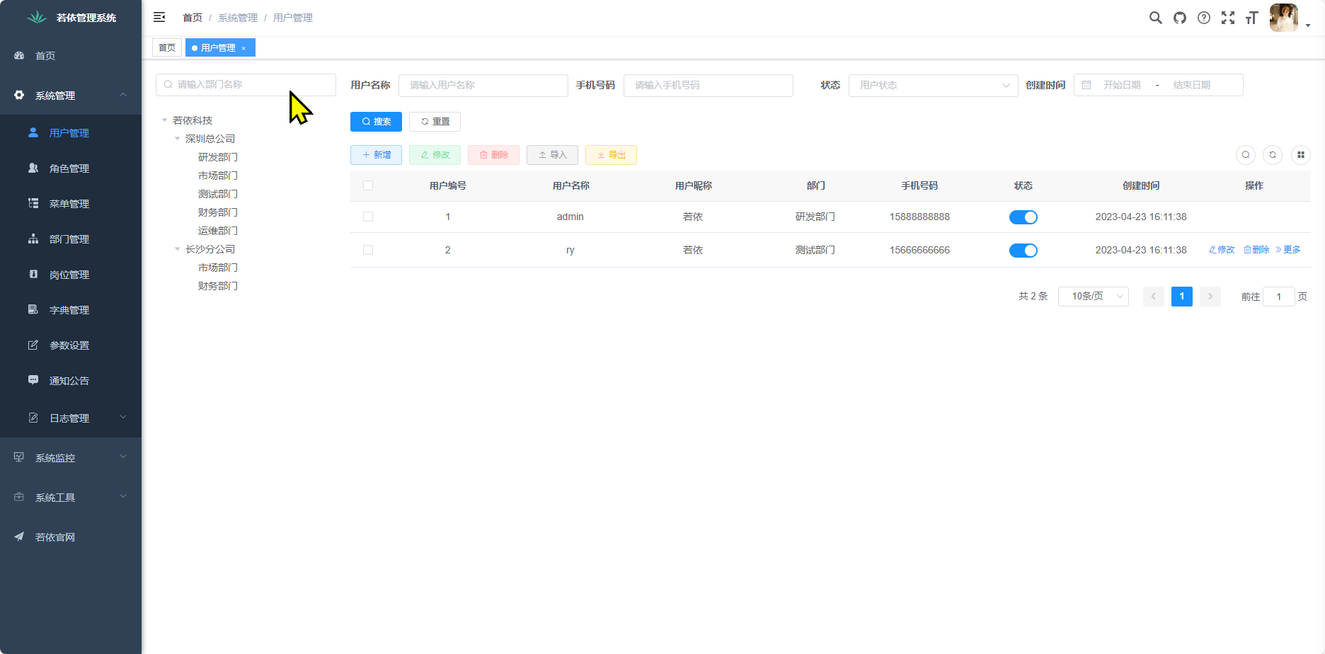 部门管理:配置系统组织机构(公司、部门、小组),树结构展现支持数据权限。