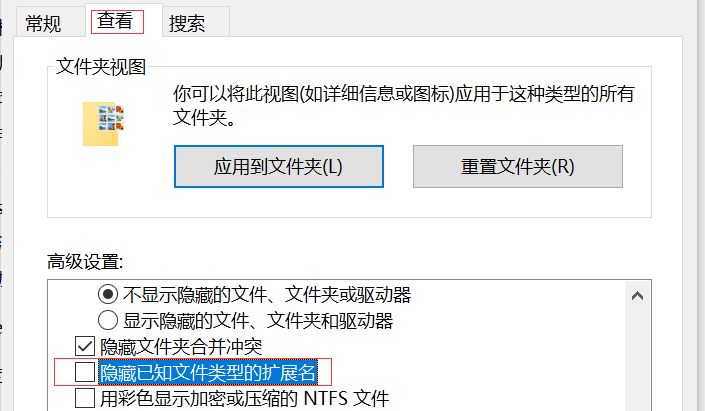 然后点查看 -> 取消勾选隐藏已知文件类型的扩展名 -> 应用。再返回查看文本文件就能看到带.txt后缀了。