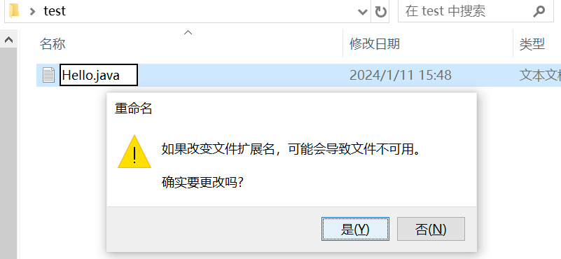 将.txt后缀改为.java,一定要出现如下提示才说明后缀(文件类型)改成功。