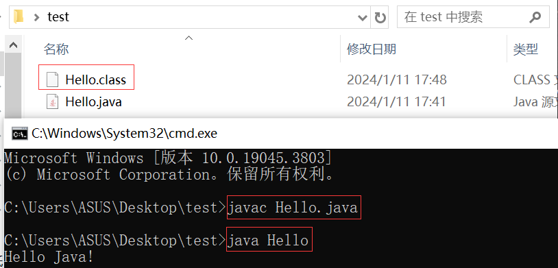 准备工作完成后在上方的目录路径栏输入cmd回车,如下图,分别输入javac Hello.java和java Hello,最后成功输出Hello Java!