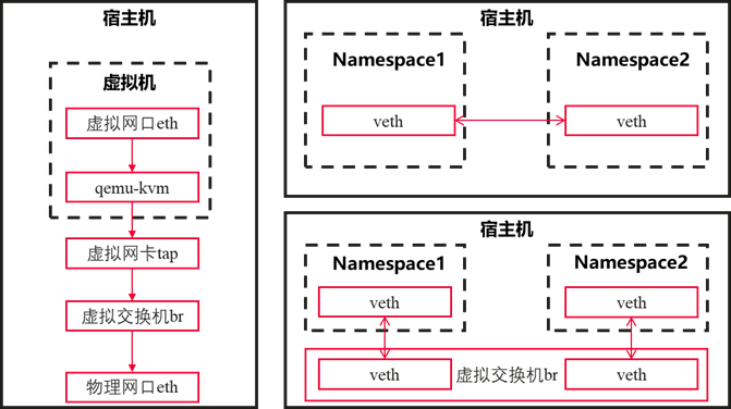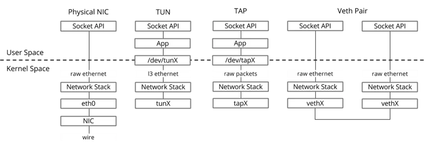 Linux内核模块tap/tun及veth-pair实现了虚拟网卡的的功能:
