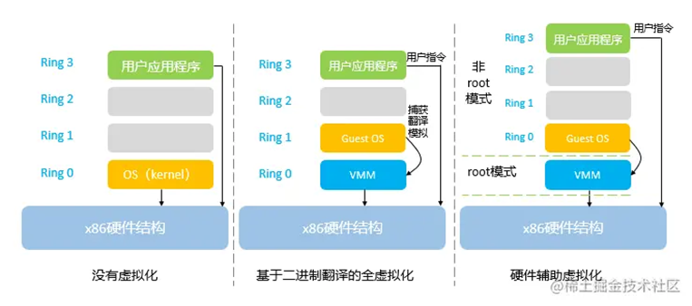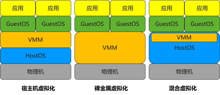 GuestOS在HostOS和VMM看来是一个应用,运行在用户态只会执行Ring3级别指令。但是,GuestOS作为一个完整的操作系统,会下发Ring0级别的指令,此时会造成异常。根据处理异常的方式,引出三种类型虚拟化: