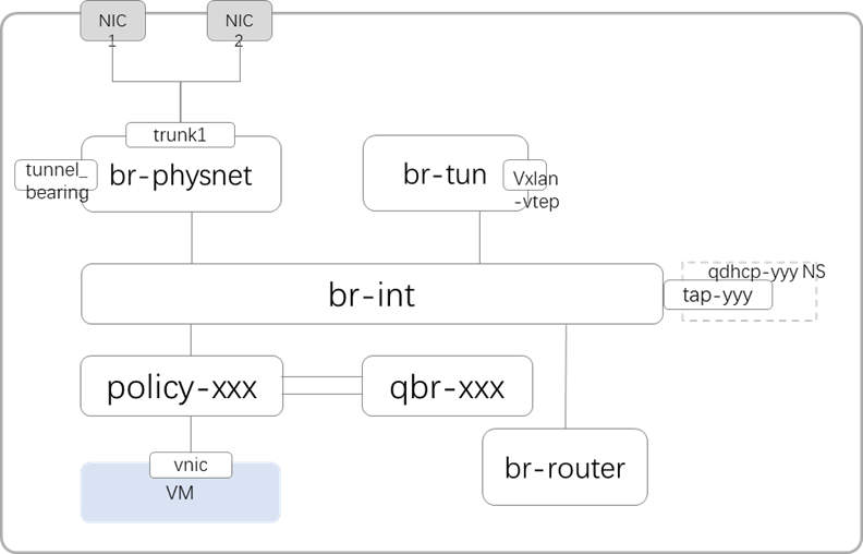 - policy(ply)/qbr网桥:提供虚拟机ACL、QoS等功能。