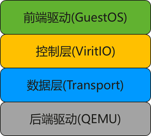 VirtIO是一种IO半虚拟化方案。此方案规定了客户机与Hypervisor(例如KVM等)的IO通信协议。该方案可分为四层: