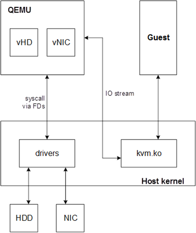 - QEMU:系统模拟器,运行在用户态,负责解释来自KVM的IO指令,转换成Host OS的系统调用,让Host OS完成真正的IO操作。