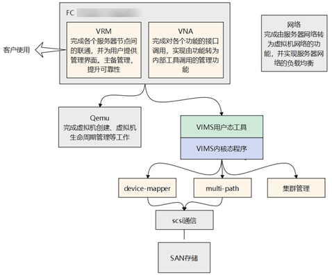 通过共享磁盘文件系统(又称共享集群文件系统)方式实现底层异构存储(集中式、本地磁盘、分布式)资源的统一池化。OCFS2是Oracle开发的共享磁盘文件系统,华为虚拟化平台FusionCompute的VIMS共享磁盘文件系统就是基于OCFS2进行定制开发的。VIMS介于服务器与底层存储之间,向虚拟机操作系统提供对磁盘集群的访问能力。