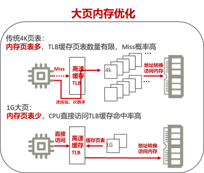 页表缓存(TLB)具有固定数据的空间槽,用于存放将内存虚拟地址映射至物理地址的标签页表条目。当内存分页调大时,页表数量就变小,TLB能映射更多的内存,提高CPU内存寻址负载。内存=页表数量×大页内存。