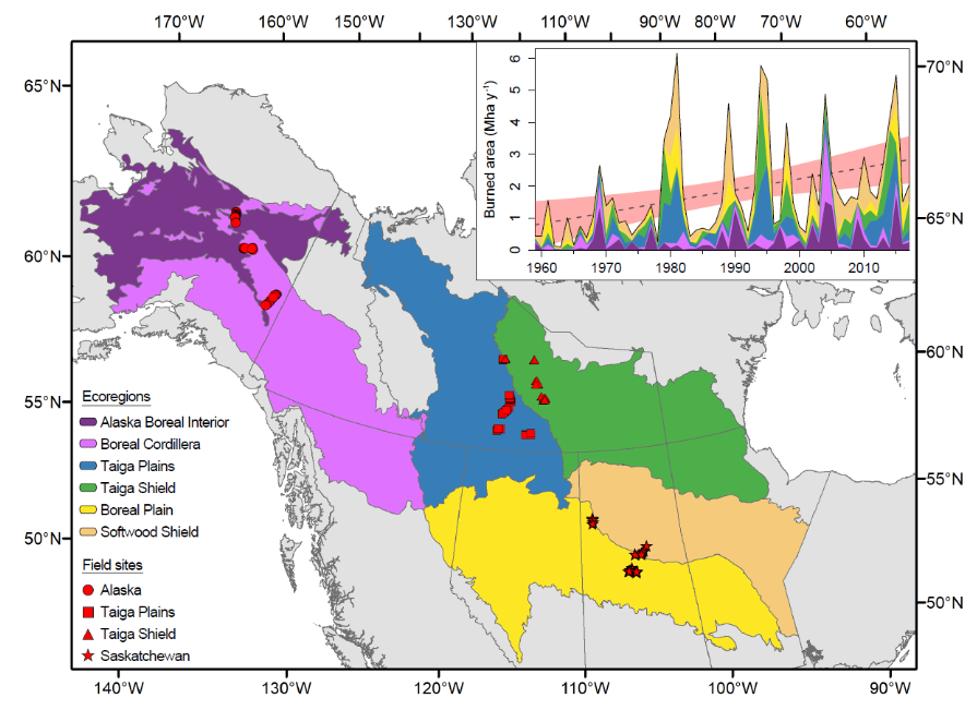 研究人员从北美西部北方森林的 1,019 个烧毁地点和 152 个对照地点(即没有火灾历史记录)获取了数据,这些地点横跨六个不同的生态区,近几十年来,这些地区的烧毁面积有所增加(图 1)。研究地点位于阿拉斯加内陆北方地区、北方科迪勒拉山系、泰加平原、泰加盾林、软木盾林和北方平原等生态区域,这些生态区域在地质历史、土壤发育和母质以及年平均温度和降水量方面各不相同(Wang 等,2016 年)。 不同研究的地点选择和取样方法各不相同,但都提供了与火灾前树种组成、林龄、地形以及火灾前后地上和地下碳库相关的实地收集数据。