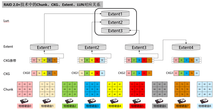 - Lun:来自不同CKG(覆盖硬盘域中所有硬盘)的Extent组成一个逻辑硬盘挂给主机使用。