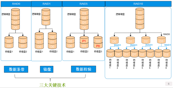 RAID即独立磁盘冗余阵列,将多个物理磁盘组合成一个逻辑磁盘,提高其读写性能以及冗余容灾能力。RAID主要包含三大技术模块: