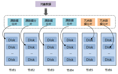 上图以EC4+2为例,共计6个分片分布到6个节点上,允许同时故障两个节点数据不丢失。