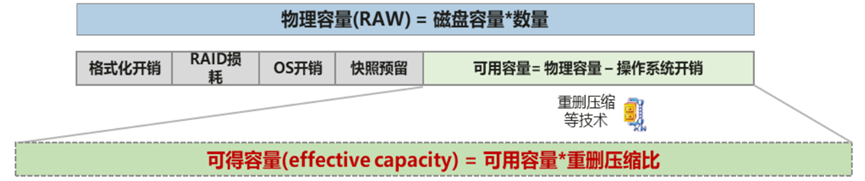 - 可得容量:又称有效容量。即采用重删压缩技术后,可实际写入存储的数据容量。