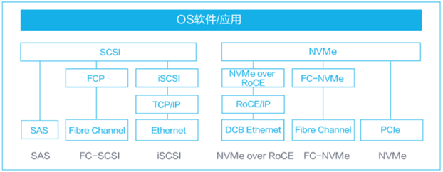 传统的块存储协议主要是SCSI协议。NVME协议作为新一代块存储协议,定义了一套新的块存储协议命令集,无论从时延、带宽都比SCSI协议要强。SCSI和NVME协议栈的对比如下: