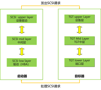 - SCSI协议即小型计算机接口协议,规定了一套不同设备之间(例如主机、存储、光设备、网络设备)进行数据交互的模型和规范,是一个跟具体传输介质解耦的C-S架构的协议。协议结构中主要模块是作为Client的启动器(Initiator)和作为Server的目标器(Target)。