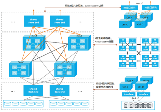 控制框内控制器、前端接口模块和后端接口模块通常采用SmartMatrix 高速全互联均衡架构。即任一前端接口模块通过PCIE接口与任一控制器互联,框内所有控制器之间互联,任一后端接口模块通过PCIE接口与任一控制器互联。如果扩展控制框、硬盘框,同理框间全互联。